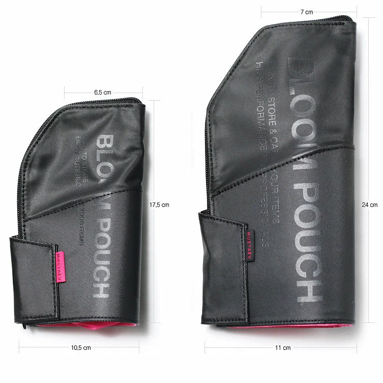 The Bloom Pouch stores brushes along with various products. The pouch can easily be folded to create a standing holder or zipped closed to conveniently store brushes and products. It is very portable and great for travel or everyday use. Offered in two sizes Small and Large.