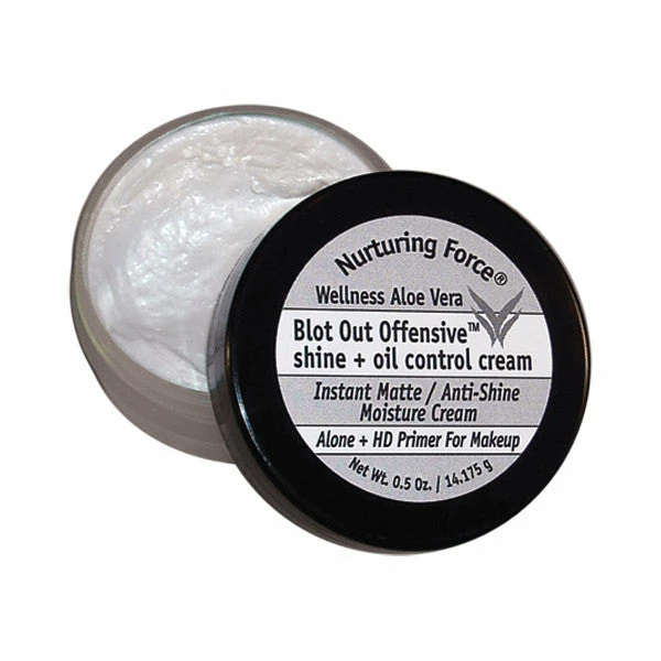 Nurturing Force Blot Out Offensive is not a gel or a liquid, but a moisturizing cream that makes shiny skin an instant matte canvas. Use as a Primer under make-up, as a barrier cream, or alone. No matter which way, it will champion your need for anti-shine by providing a smoothing velvet finish to skin. The formula is without silicone (dimethicone), without parabens, without added fragrance or color, providing skin with smoothing natural anti-aging + antioxidants through its Aloe Vera Gel First Formula.