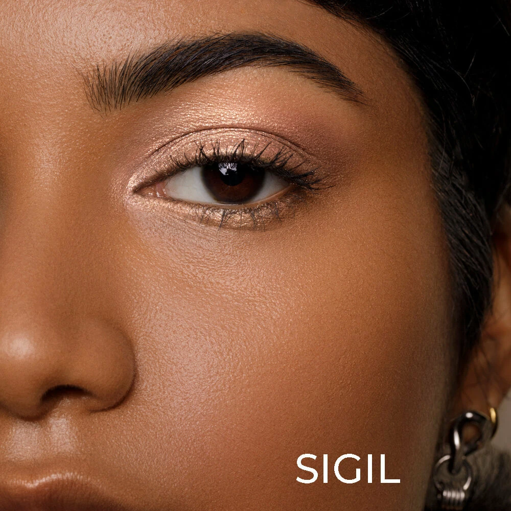 Sigil: A warm champagne gold with a hint of pale pink. This shade is a resonant whisper. Sigil brings light to any eye color, and can be worn either as an all-over wash, a highlight, or a brightening liner.