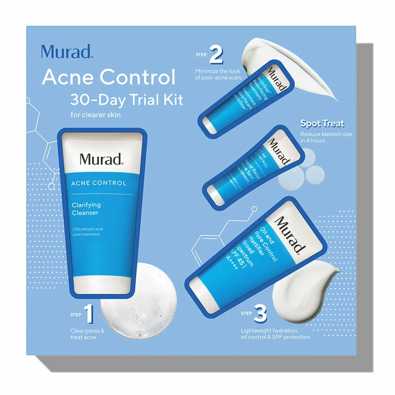 Four-piece trial-size kit that helps minimize acne breakouts & scarring ($53.00 value).