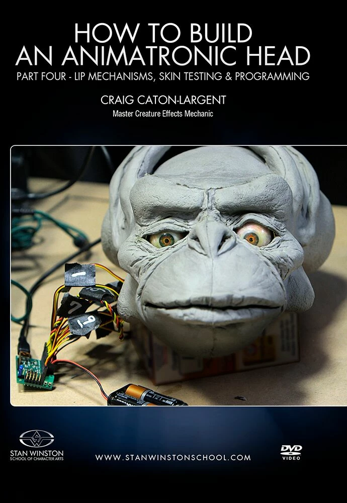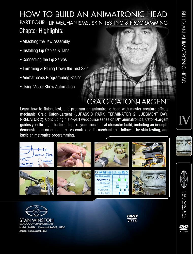 Concluding his 4-part webcourse series on DIY animatronics, Caton-Largent guides you through the final steps of your mechanical character build, including an in-depth demonstration on creating servo-controlled lip mechanisms, followed by skin testing, and basic animatronics programming.